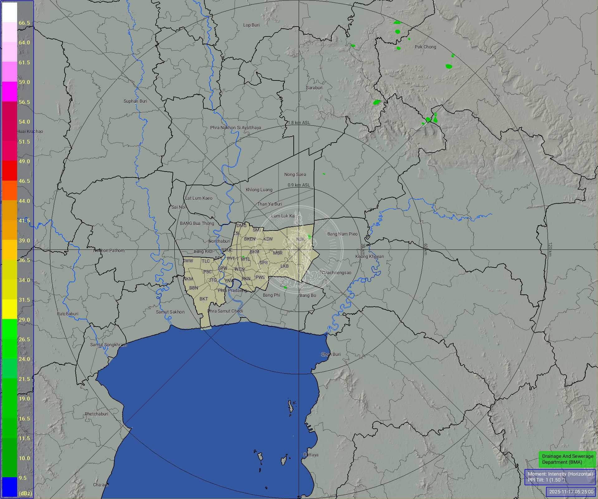 เวลา 11.40 น. รายงานสภาพอากาศพื้นที่กรุงเทพมหานคร ฝนเล็กน้อย-ปานกลางกระจายพื้นที่ กทม. จ.นนทบุรี อ.ลำลูกกา เคลื่อนทิศตะวันออกเฉียงใต้ ปริมาณฝนสูงสุดเขตมีนบุรี 20.5 มม. เขตจตุจักร 12.5 มม. // ศูนย์ป้องกันน้ำท่วมกทม.