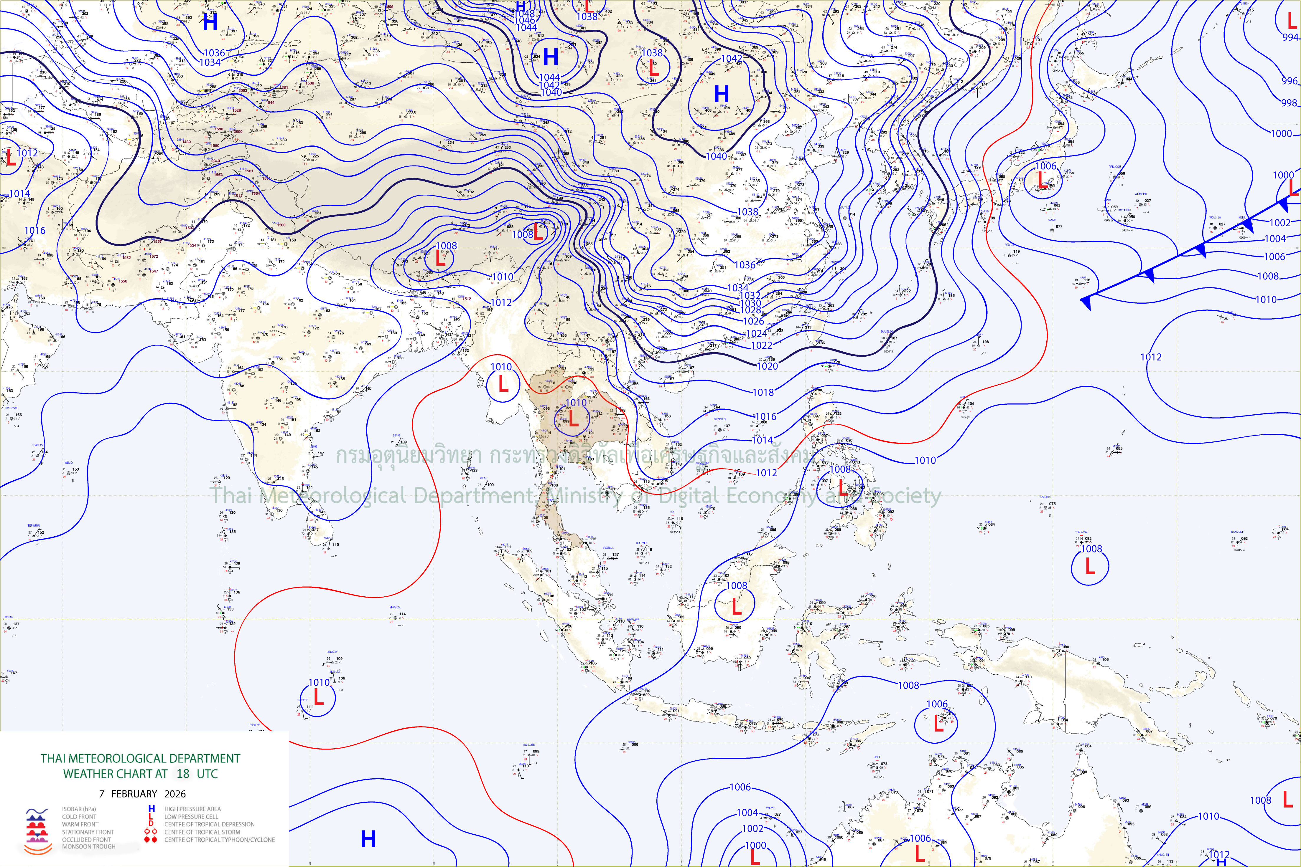 พยากรณ์อากาศ 24 ชั่วโมงข้างหน้า บริเวณความกดอากาศสูงหรือมวลอากาศเย็นกำลังปานกลางถึงค่อนข้างแรงระลอกใหม่จากประเทศจีนได้แผ่ลงมาปกคลุมประเทศจีนตอนใต้ และประเทศเวียดนามตอนบนแล้ว คาดว่าจะแผ่ลงมาปกคลุมประเทศลาวตอนบน ภาคตะวันออกเฉียงเหนือตอนบน และทะเลจีนใต้ในวันพรุ่งนี้ (8 ก.พ. 2569) ลักษณะเช่นนี้ทำให้ภาคตะวันออกเฉียงเหนือมีลมแรง ในขณะที่มีลมใต้และลมตะวันออกเฉียงใต้ที่พัดนำความชื้นจากทะเลจีนใต้และอ่าวไทยเข้ามาปกคลุมภาคกลาง รวมทั้งกรุงเทพมหานครและปริมณฑล และภาคตะวันออก ทำให้บริเวณดังกล่าวมีฝนฟ้าคะนองบางแห่งเกิดขึ้นได้