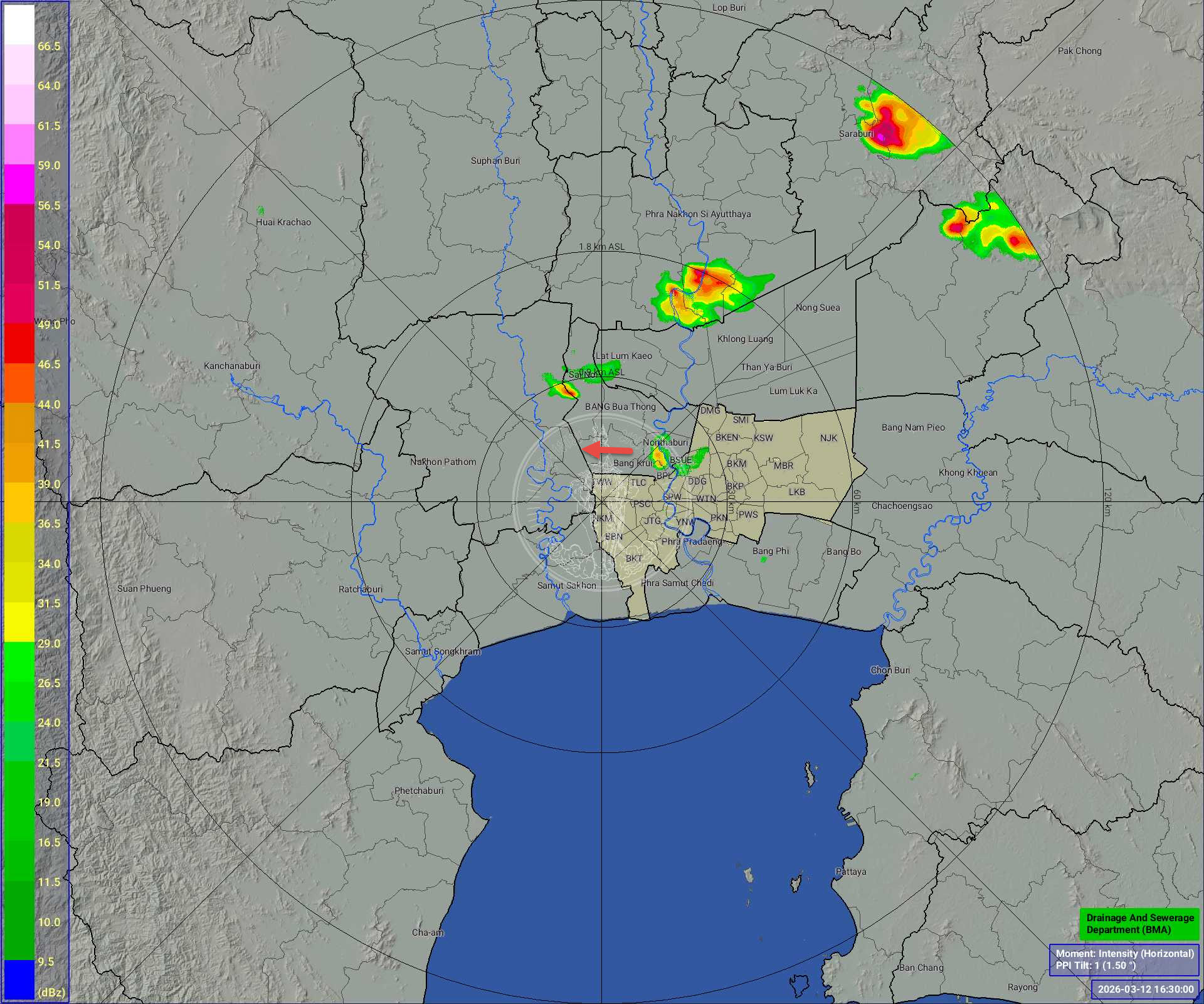 วันที่ 12 มีนาคม 2569 เวลา 16.30 น. รายงานสภาพอากาศพื้นที่กรุงเทพมหานคร ฝนเล็กน้อย เขตจตุจักร บางซื่อ เคลื่อนตัวทิศตะวันตก แนวโน้มลดลง /ปริมาณฝนสูงสุดเขตสัมพันธวงศ์ 15.0 มม.
